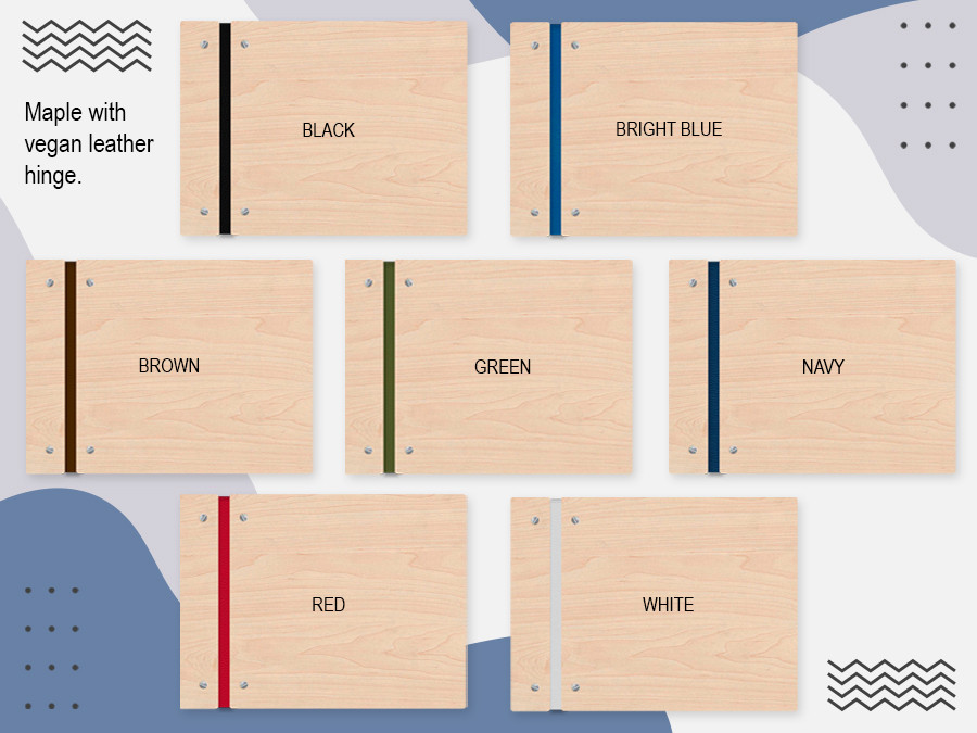 Choose Cherry or Maple (1/8 wood veneer with MDF core) and your hinge color (vegan leather), then add your details in the customization area. The solid back gives added support for readers and writers. A proof will be sent to you for approval prior to beginning your order.