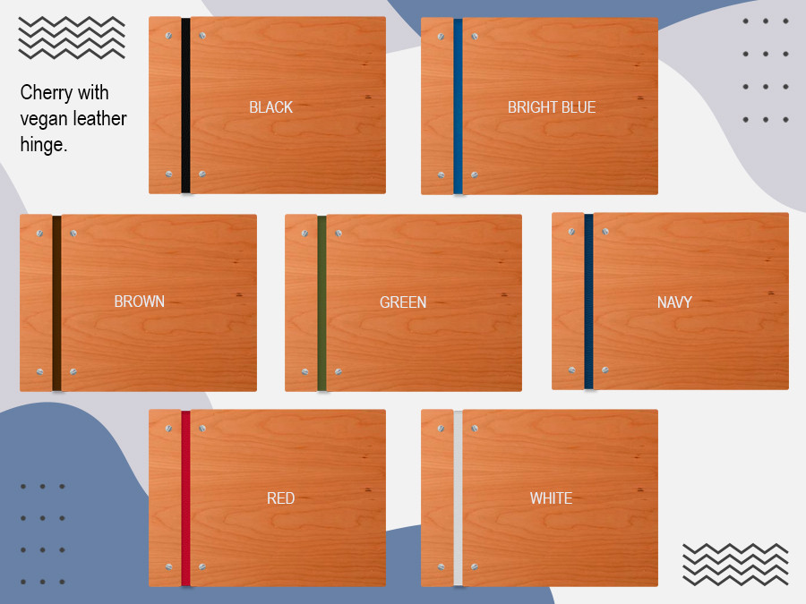 Choose Cherry or Maple (1/8 wood veneer with MDF core) and your hinge color (vegan leather), then add your details in the customization area. The solid back gives added support for readers and writers. A proof will be sent to you for approval prior to beginning your order.